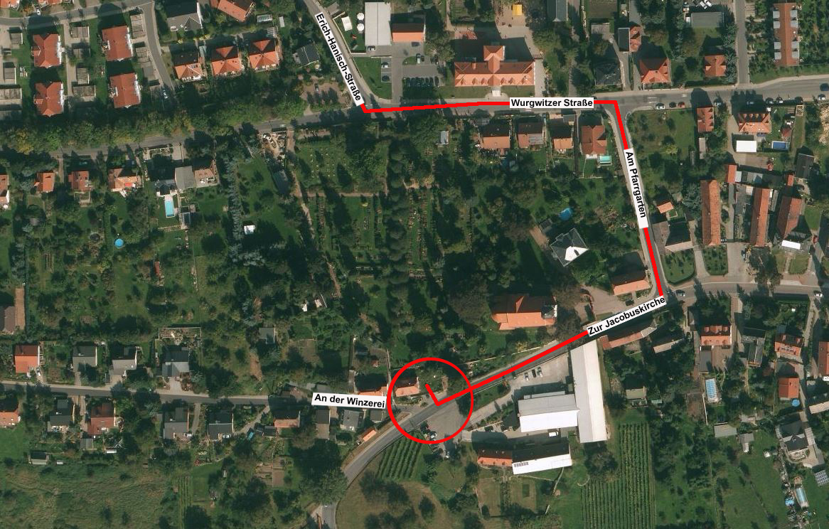 • Abfahrt Dresden Gorbitz • rechts auf die B 173 Richtung Dresden Zentrum • kurz vor Möbelmarkt "Möbel-Kraft" rechts in die Pennricher Straße abbiegen• ca. 1 km auf der Pennricher Straße bis zur Wurgwitzer Straße fahren • links in Richtung Pesterwitz ca. 1 km • rechts nach dem Friedhof in die Einbahnstraße abbiegen • bis zur nächsten Kreuzung • dann wieder rechts abbiegen • nach 100 m sind Sie am Fachwerkhaus angekommen.